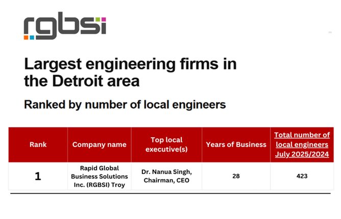RGBSI is proud to announce its recognition as the largest engineering company in the Detroit area, according to Crain’s Detroit Business 2025 rankings. This acknowledgment highlights our strong engineering foundation, the dedication of our technical teams, and our continued commitment to advancing innovation within Southeast Michigan and across global industries.